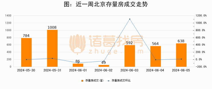 从存量房来看,2024年06月05日北京存量房单日成交638套,比昨日增加74套,环比上涨13.1%。从近一周存量房成交来看,北京存量房日均成交套数为531套,06月05日单日成交638套,高于近一周平均水平20.2%。