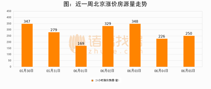 根据诸葛找房数据显示,北京24小时涨价房源量为250套,较06月04日增加24套,环比上涨10.6%。与此同时,涨价房源占比小幅扩大,业主信心有所提升。