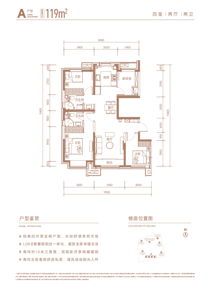 南向9.85米三面宽,客厅主卧都有更宽的采光。客厅带阳台,主卧套房。