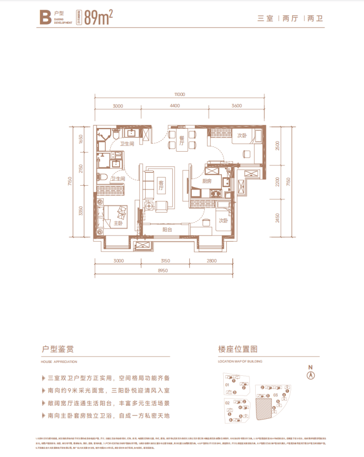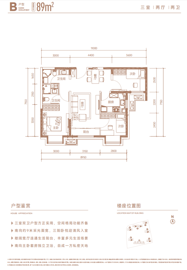 而且建面约89平的三居户型还做了主卧带飘窗套房!做了双卫!南向客厅还有阳台!简直把空间利用率发挥到了极致。