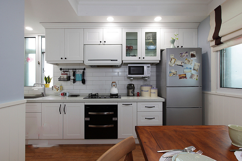 目前内嵌式的设计十分流行,将冰箱,微波炉、消毒柜等厨电嵌入橱柜或墙体,节省了空间,也让厨电轻松隐身,厨房会更显宽大。而台面没有了一些多余的电器,也会更加整洁,甚至清洁打扫台面都变轻松了。