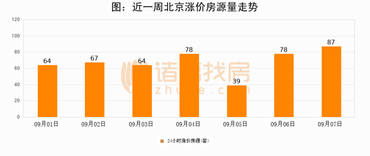 根据诸葛找房数据显示,北京24小时涨价房源量为87套,较09月06日增加9套,环比上涨11.5%。与此同时,涨价房源占比小幅扩大,业主信心有所提升。