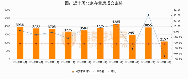 存量房方面,第38周北京存量房成交2157套,较上周减少1698套,环比下降44%。从近十周成交走势来看,周均成交套数为3517套,本周低于平均水平38.7%。