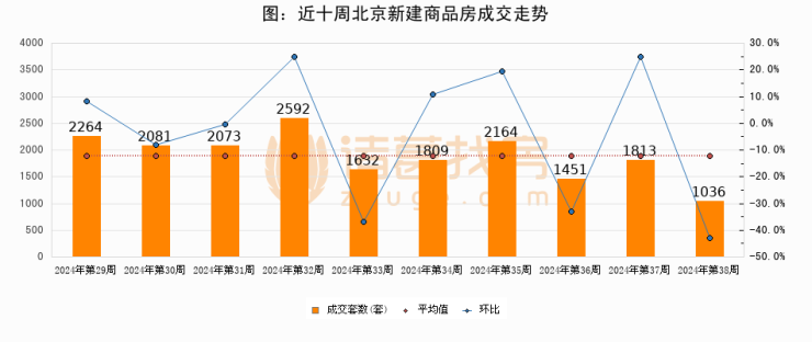 进入2024年第38周(09月16日-09月22日),北京新建商品房成交1036套,较上周减少777套,环比下降42.9%。从近十周成交来看,周均成交套数为1891套,本周成交1036套,低于近十周平均成交量45.2%。