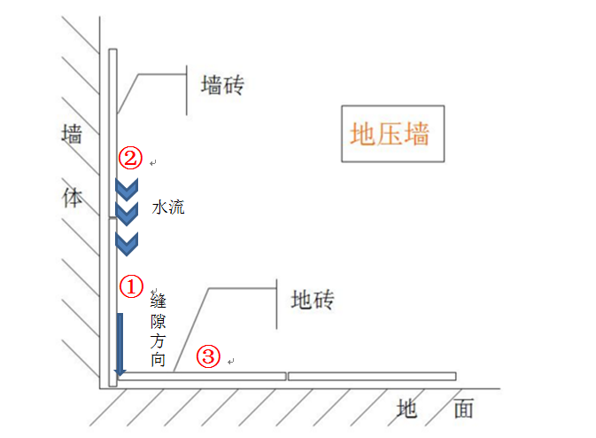 简单的说就是先贴墙砖,等墙砖贴好后把地砖压着墙砖贴好。这样做快捷方便,但是地压墙有一个诟病,就是地砖和墙砖之间的缝隙是可见的,即使做了防水,水依然会慢慢地渗透下去,容易导致防水层加速老化。