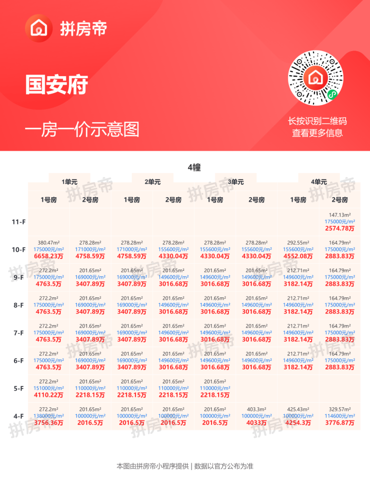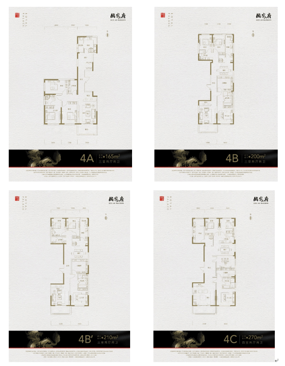 4号楼户型以165三居、200三居、210三居、270四居为主,共54套,由于临路、低楼层为商业等诸多因素,均价约为14.8万/平米。