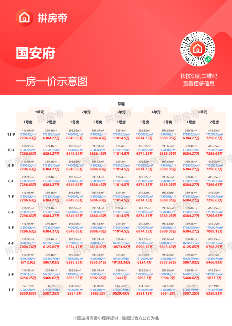 6号楼位于小区中心位置,为楼王,户型以370-390-420-630户型为主,共99套,大户型为主,均价约17万/平米。