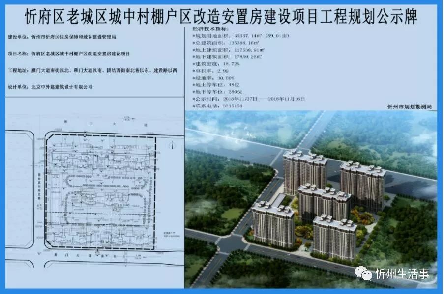 忻府区老城区城中村棚户区改造安置房建设项目工程规划公示牌 建设单位:忻州市忻府区住房保障和城乡建设管理局 项目名称:忻府区老城区城中村棚户区改造安置房建设项目 工程地址:雁门大道南街以北、雁门大道以南、团结西街南北巷以东、建设路以西 建设单位:北京中外建建筑设计有限公司