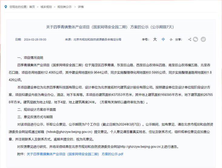 据最新消息,2月28日北京市规划和自然资源委员会海淀分局,进行了关于四季青镇集体产业项目(国家网络安全园二期)的方案公示。