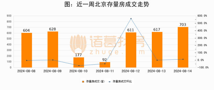 从存量房来看,2024年08月14日北京存量房单日成交703套,比昨日增加86套,环比上涨13.9%。从近一周存量房成交来看,北京存量房日均成交套数为490套,08月14日单日成交703套,高于近一周平均水平43.5%。