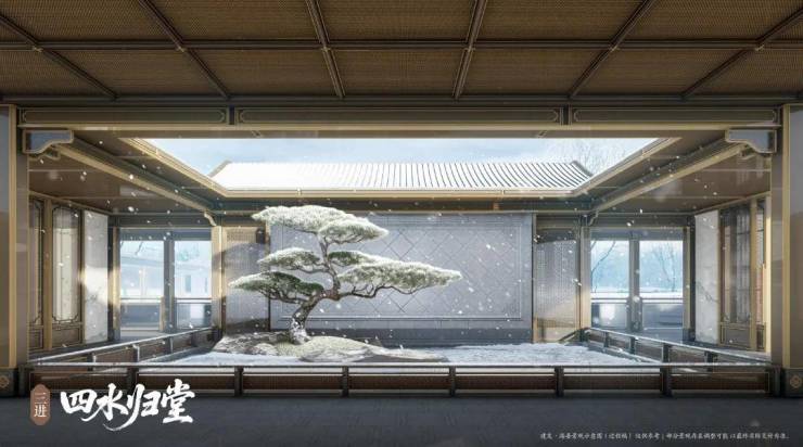 四进礼序如时空密钥层层启转:一进门前福海,迎紫气东来;二进四季庭院如意峰,取法颐和海棠如意石;三进四水归堂携约72.8米四季长廊,致敬颐和园728米彩画长廊;四进谐趣园,观鱼、听泉,移步异景。