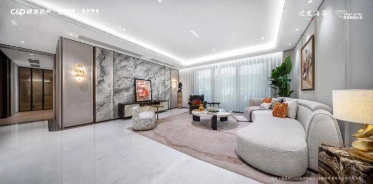 建发·海晏用最高约3.6米层高发起降维打击,带给业主的威仪感呈几何级增长。楼王6号楼的约3.6米挑空区,阳光穿透超白玻在芬迪白石材墙面游走,恰似西山晴雪的光影魔术。