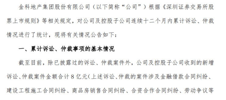 另一方面,金科股份还不时面临来自各方的诉讼、仲裁等,债务规模不断在扩大。10月15日,金科股份发布《关于公司及控股子公司累计诉讼及仲裁事项的公告》,截至目前,除已披露过的诉讼、仲裁案件外,公司及控股子公司收到的新增诉讼、仲裁案件金额合计8亿元。