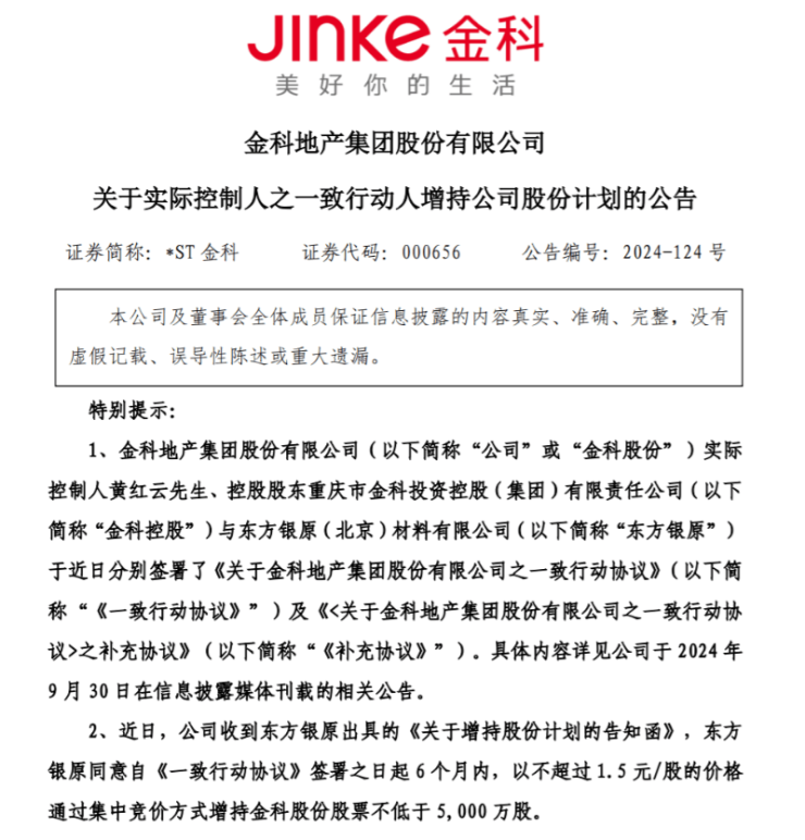 根据协议,东方银原计划在6个月内以不超过1.5元/股的价格增持金科股份至少5000万股。而根据相关协议约定,东方银原已将不低于7500万元增持资金存入本次增持的证券账户,并已通过二级市场以集中竞价交易方式增持公司股份41.82万股。