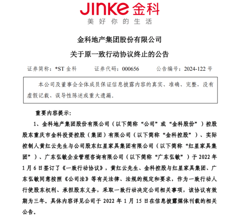 而随着新的一致行动人入场,此前金科控股、黄红云与红星家具集团的一致行动人关系也宣告终止。