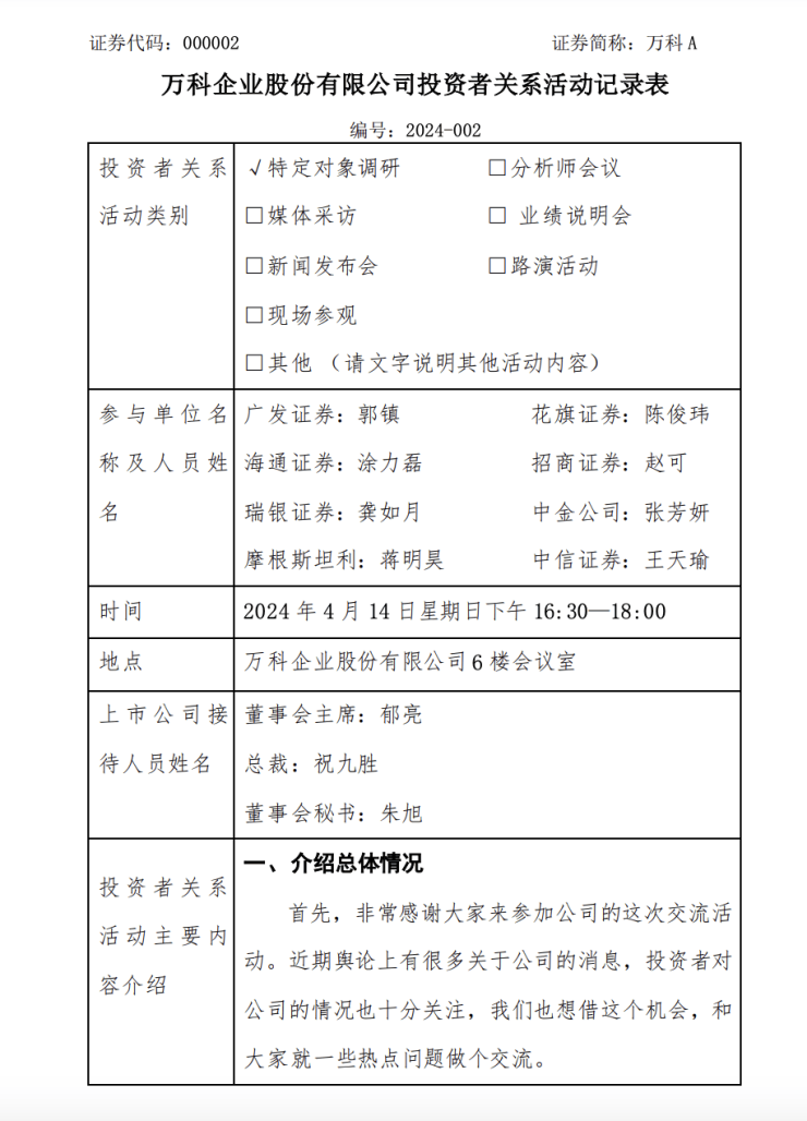 针对近期多条舆论消息,万科企业股份有限公司(万科A,000002.SZ)于4月14日召开投资者交流会,万科董事会主席郁亮、总裁祝九胜、董事会秘书朱旭出席。