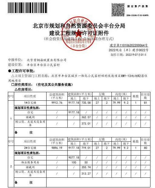 北京首钢海赋置业有限公司于2022年6月1日通过挂牌出让形式取得丰台区小瓦窑村XWY-13地块项目建设用地使用权,拿地后仅30天就取得了建设工程规划许可证,继华润置地纪家庙项目后,再次刷新了丰台区集中供地以来办理建设工程规划许可证的记录。