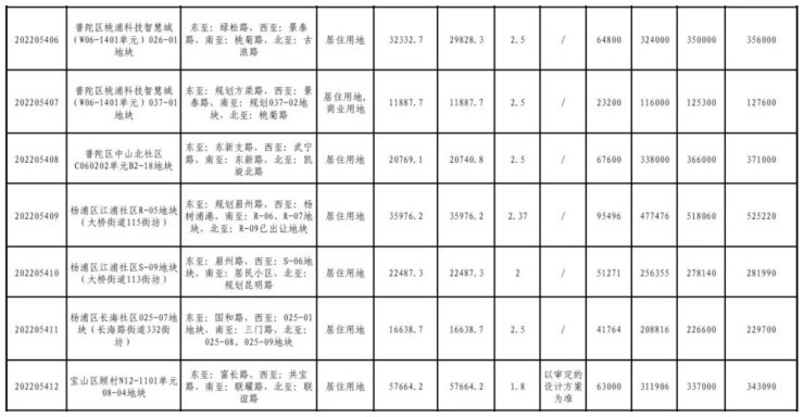 从土地面积来看,面积较大的为青浦区徐泾镇双联路北侧B6-01地块,土地面积约为7.71万平方米;面积排在第二位的是嘉定区嘉定新城(马陆镇)马陆南社区JDC1-2301单元23-01、29-01地块,土地面积约为7.35万平方米。