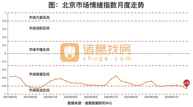 根据诸葛找房数据研究中心监测数据显示,2024年04月,北京市场情绪指数为-0.87,较上月下降0.06,位于市场低迷区间。