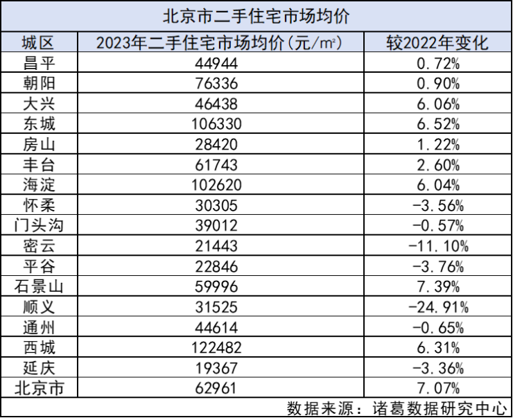 区域之间亦存在分化,诸葛找房数据显示,2023年北京顺义区二手房房价下降幅度最高达24.9%;密云次之降幅为11.1%;东城、大兴、海淀则实现了同比6%的涨幅。