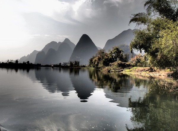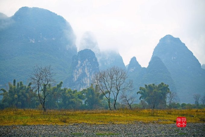 这里山重水曲,古树葱龙,在山岚笼罩下,江面隐约可见捕鱼竹筏,飘然往来。如此美景,难怪人说:“阳朔山水在兴坪。”