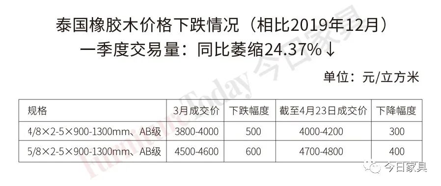 以江西南康市场交易数据为例。根据中国木材价格指数网监测数据显示,一季度江西南康泰国橡胶木交易量同比萎缩24.37%,并且在价格方面,3月份出现明显的下跌。