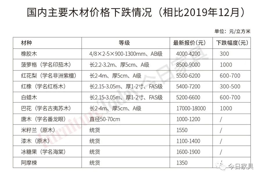 而在价格方面,尽管有部分材种因短期全球疫情影响短期供需失衡出现价格上涨,如刺猬紫檀和墨西哥阔变豆价格较2019年12月每吨上涨了500元左右,但后市预期悲观情绪占据主导,各类木材价格还是涨少跌多,尤其是家具材市场,市场惨淡一片。