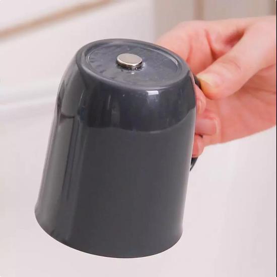 简单!在杯子下面黏上小吸铁石,墙壁上面黏上小磁铁片。这样他们就能自动吸在一起了。这样悬浮收纳的好处,就在于日常打扫清洁的时候很方便,没有阻挡。