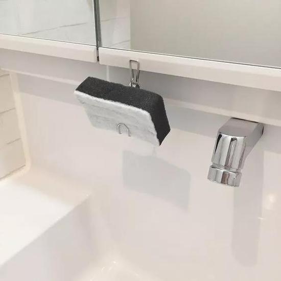 倒挂夹子,用夹子夹住柜子边缘,下面的挂钩用来放洗碗棉,这是哪位机智的朋友发明的?远离水渍,让洗碗棉更干净,这难道就是生活中的小舒心?