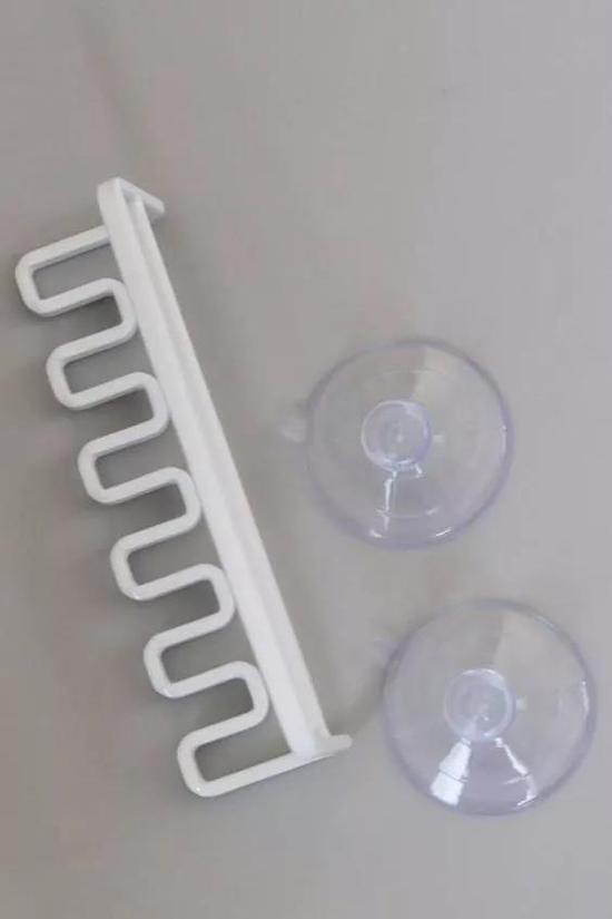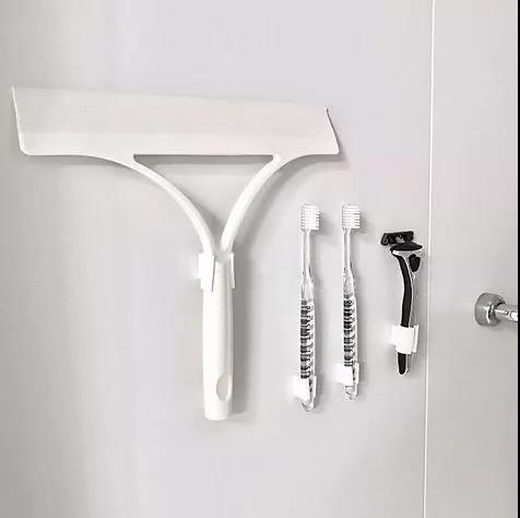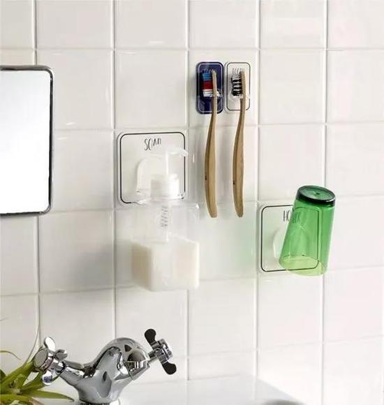 除了免钉胶,还有自带黏性的置物架。因为卫生间洗漱池需要收纳的零碎特别多,所以更多时候,可以用悬挂的方式来说收纳。比如,把牙刷架黏贴在墙上或者柜门上。