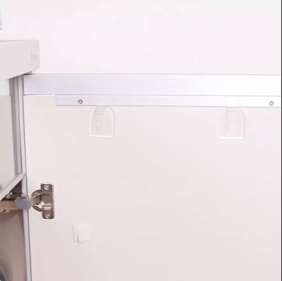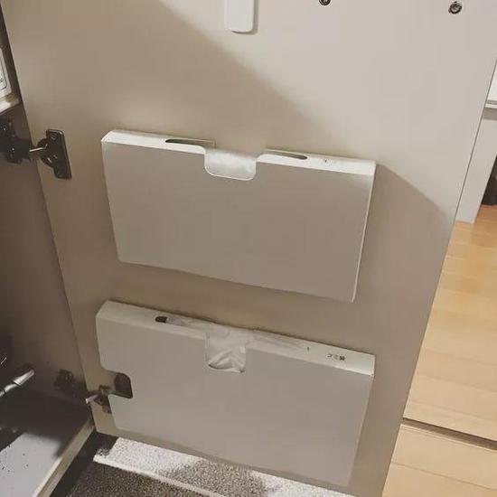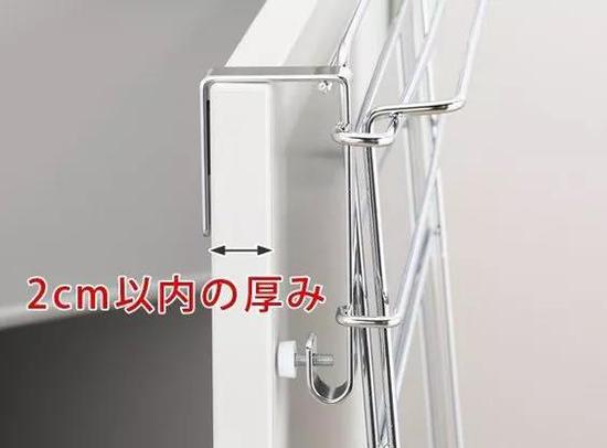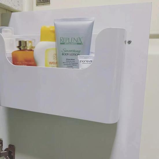 卡在柜门边上的置物架,也是无处不在的。各种柜门都可以置物,有了这样的操作,谁还打孔收纳啊?