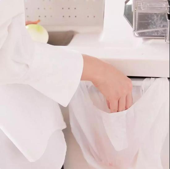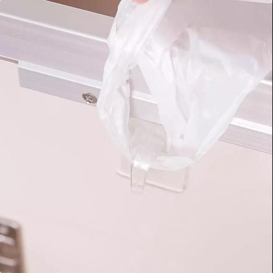 挂上塑料袋,把塑料袋翻到柜门外侧,这样就变成了一个垃圾袋(也不怎么神奇嘛)。这样在做饭的时候,顺手扔垃圾,也不会让垃圾的污渍溅到橱柜内壁,也减少了扔垃圾的动作(说不神奇的,一看就没做过家务活)。