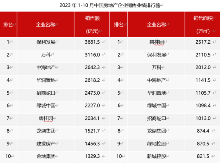 根据中指研究院统计数据,今年前10个月,保利发展、万科、中海地产的销售额分别为3681.5亿元、3116亿元和2642.3亿元。