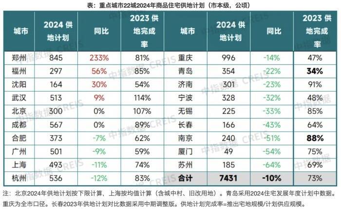截至6月末,据中指监测,重点22城中有20城发布了2024年供地计划,整体同比下降约10%。