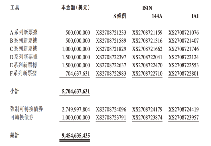 具体来看,融创中国作为部分重组对价发行的工具(包括新票据、 强制可转换债券、可转换债券)如下: