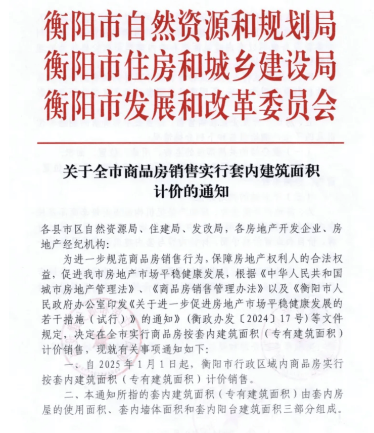 此前的12月12日,湖南省衡阳市亦发文明确,自2025年1月1日起商品房销售实行套内建筑面积计价。
