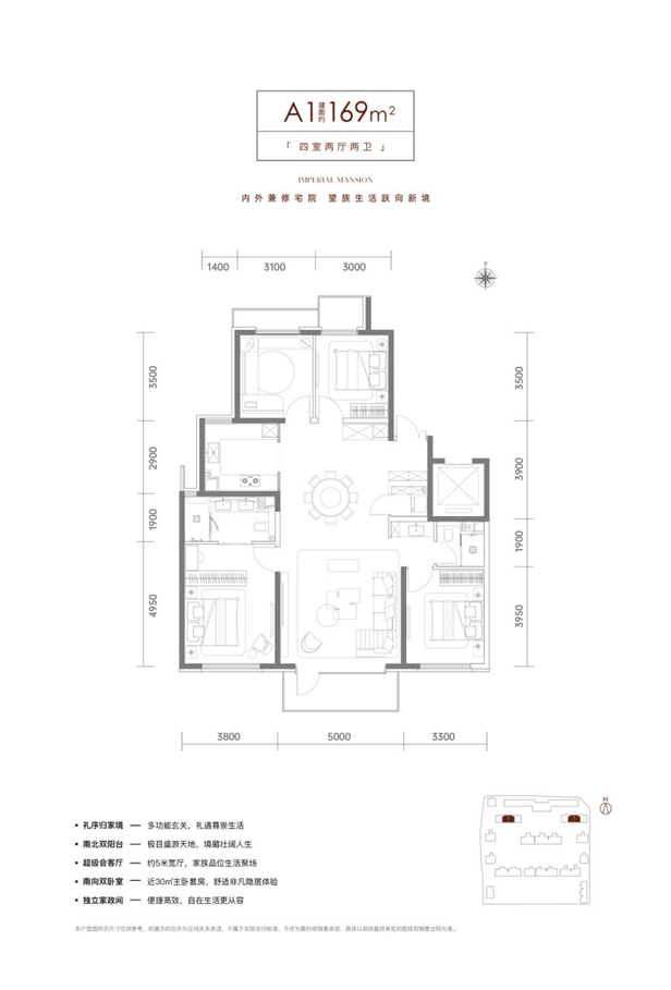 以169平米四居为例,字母双开门+入户玄关给足仪式感,约5米宽客厅+外敞式阳台不仅提供了全家人交流活动的空间,也可以将户外景观引入室内,让生活情绪岁景色变幻;南向主卧则是大开间的套房设计,独立带窗明卫既实用又舒服,日常起居更加从容便捷;北向两卧室面宽也达到3米及以上,可根据家中人口数量合理改造,灵活度很高。