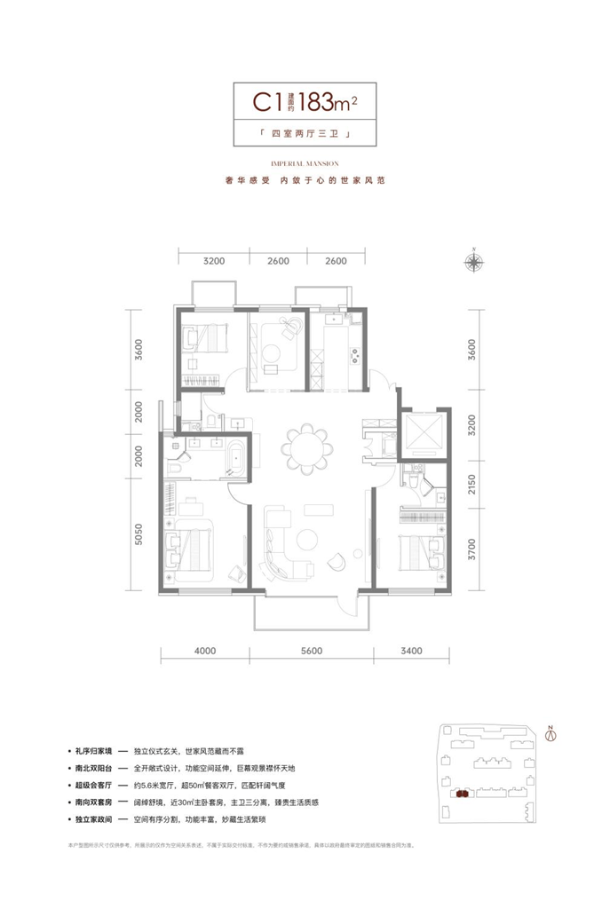 而183平米的大四居,均配备了入户玄关+独立家政间,尺度更加阔绰,客厅面宽最大5.6米,即使举办家庭聚会都能游刃有余;南向房间也升级成双套房设计,不仅主卧有放得下浴缸的明卫,老人房也拥有独立的卫生间,生活舒适度大大提升,是很多中产家庭的首选户型。