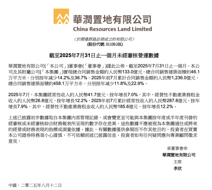 【环球网综合报道】8月12日,华润置地有限公司发布了截至2025年7月31日止一个月未经审核的营运数据。