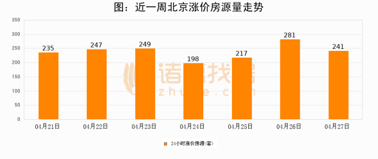 根据诸葛找房数据显示,北京24小时涨价房源量为241套,较04月26日减少40套,环比下降14.2%。与此同时,涨价房源占比小幅回落,对于购房者来说是一个入市窗口期,购房者可抓住时机入市。