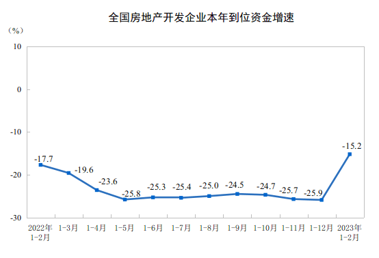 统计局数据显示,1-2月份,全国商品房销售面积15133万平方米,同比下降3.6%。其中住宅销售面积下降0.6%,增速与2022年1-12月(下降26.8%)相比,大幅回升了26.2个百分点。
