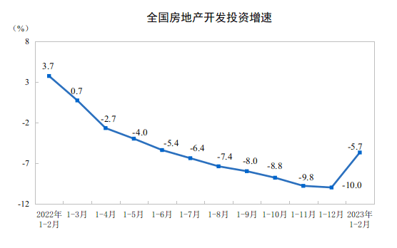 据国家统计局数据,1-2月全国房地产开发投资额13669亿元,同比下降5.7%,较2022年1-12月(下降10%)回升4.3个百分点。其中,住宅投资10273亿元,下降4.6%,回升4.9个百分点。
