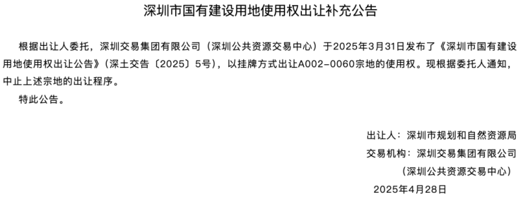 上述地块原定于4月30日出让,不过深圳市规划和自然资源局于4月28日竞买申请截止后发布补充公告,宣布中止上述宗地的出让程序。