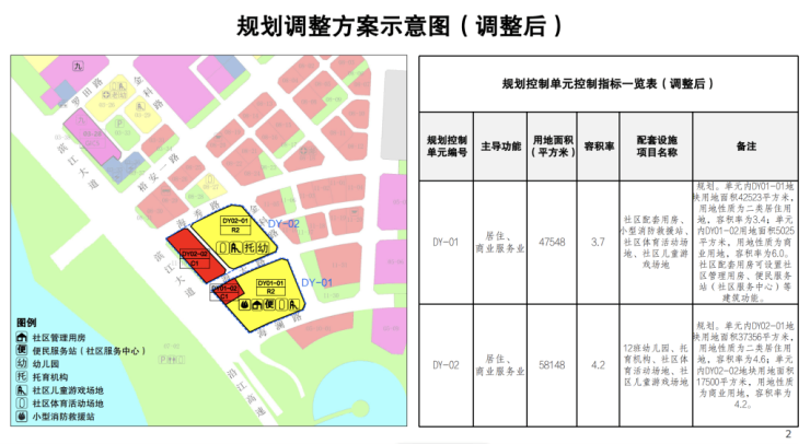 与上述地块相邻的北街坊地块(DY-02地块)同步迎来调整,规划调整后,规划控制单元DY-02新增一条支路,内部拆分为DY02-01和DY02-02两个地块,单元用地面积为58148平方米,单元主导功能为“居住、商业服务业”,容积率为4.2,配套设施为“12班幼儿园、托育机构、社区体育活动场地、社区儿童游戏场地”,备注:规划。单元内DY02-01地块用地面积37356平方米,用地性质为二类居住用地,容积率为4.6;单元内DY02-02地块用地面积17500平方米,用地性质为商业用地,容积率为4.2。