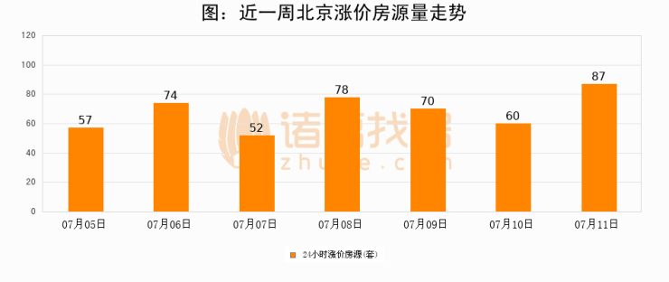 根据诸葛找房数据显示,北京24小时涨价房源量为87套,较07月10日增加27套,环比上涨45%。与此同时,涨价房源占比小幅扩大,业主信心有所提升。