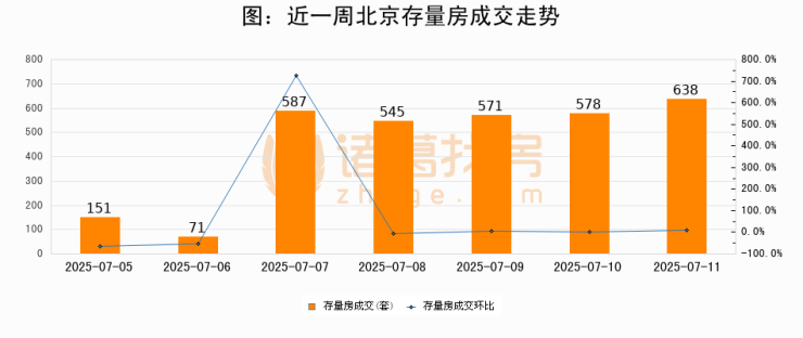 从存量房来看,2025年07月11日北京存量房单日成交638套,比昨日增加60套,环比上涨10.4%。从近一周存量房成交来看,北京存量房日均成交套数为448套,07月11日单日成交638套,高于近一周平均水平42.4%。