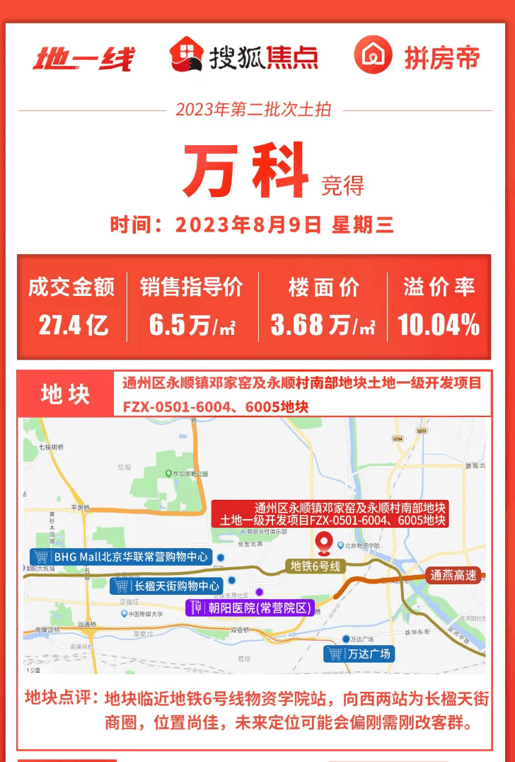 另外一块通州永顺镇地块被万科以27.4亿的价格竞得,在北京市场真的是好久没有听到万科的声音了,不知道本次万科将给购房者带来何种户型产品,地块边上有在售新盘国誉朝华户型面积为60-115平米的一至四居,目前住建委网签40套网签均价5万8,想在通州物资学院上车的可以看一看,优势是有地铁6号线配套也说的过去,劣势是这地方算通州有双限政策影响未来流通会受限制,不过自住还是可以的。