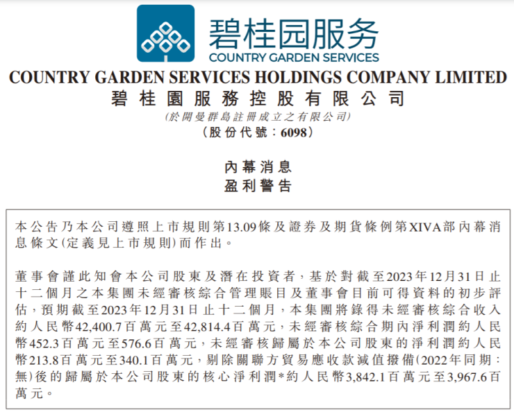 碧桂园服务预计2023年收入同比增长2.5%至3.5%,归母净利同比下降82.5%至89%