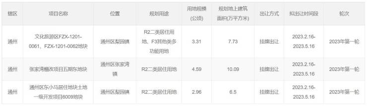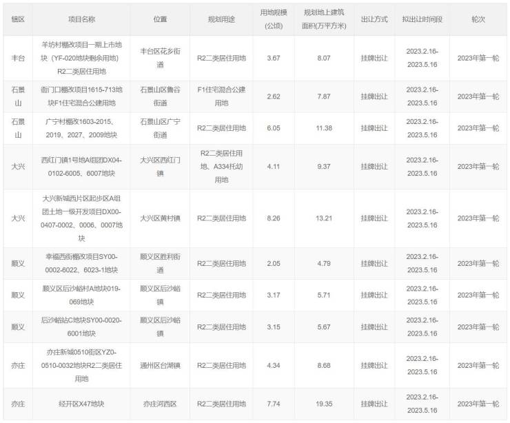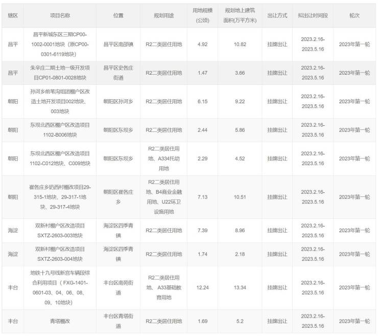 2月17日,北京市规划和自然资源委员会发布“拟供应商品住宅用地清单(2023年第一轮)”,本次清单中项目共计23宗,涉及9个区,土地面积约103公顷,拟出让时间段为2月16日至5月16日。