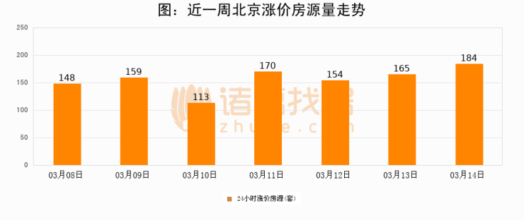 根据诸葛找房数据显示,北京24小时涨价房源量为184套,较03月13日增加19套,环比上涨11.5%。与此同时,涨价房源占比小幅扩大,业主信心有所提升。